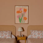 Bring a touch of springtime joy into your home with this vibrant "Flower Market" art print, inspired by Amsterdam’s famous tulip markets. The bold orange and pink tulips set against a soft peach backdrop create a playful, retro vibe that’s perfect for brightening up any room.